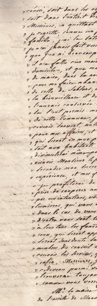 Alors comment s’est faite l’altération ?. Dans les actes religieux : Le respectable Mr Charbonnière dont la main tremblait depuis les frayeurs de la grande révolution et qui se trouvait alors dans un âge assez avancé cédait facilement la plume pour l’inscription des actes religieux. C’est ainsi qu’une main étrangère a pour la première fois altéré au religieux le nom de Sablon, cette altération plusieurs fois répétée a fini par être adopté par le desservant (curé) lui-même, par ses successeurs, bien que l’évêché continuait encore à garder l’ancienne orthographe.
